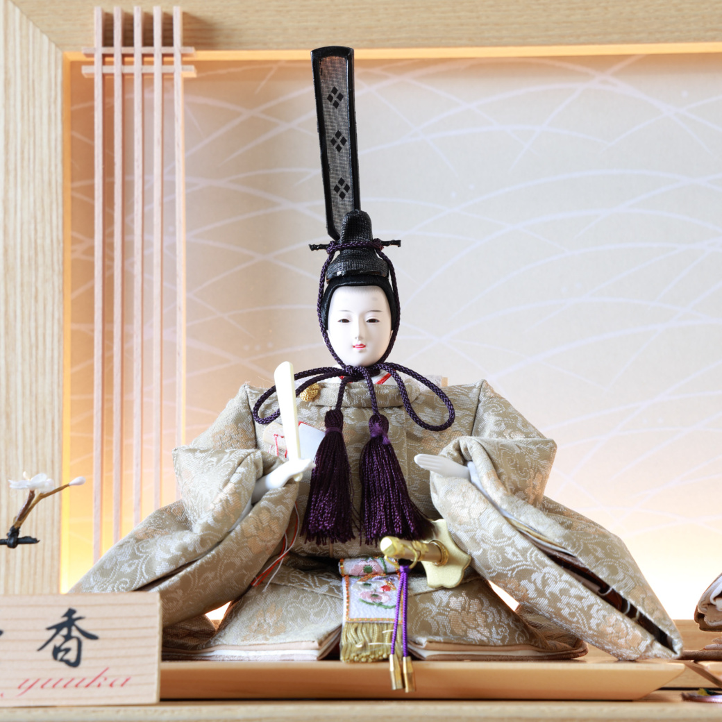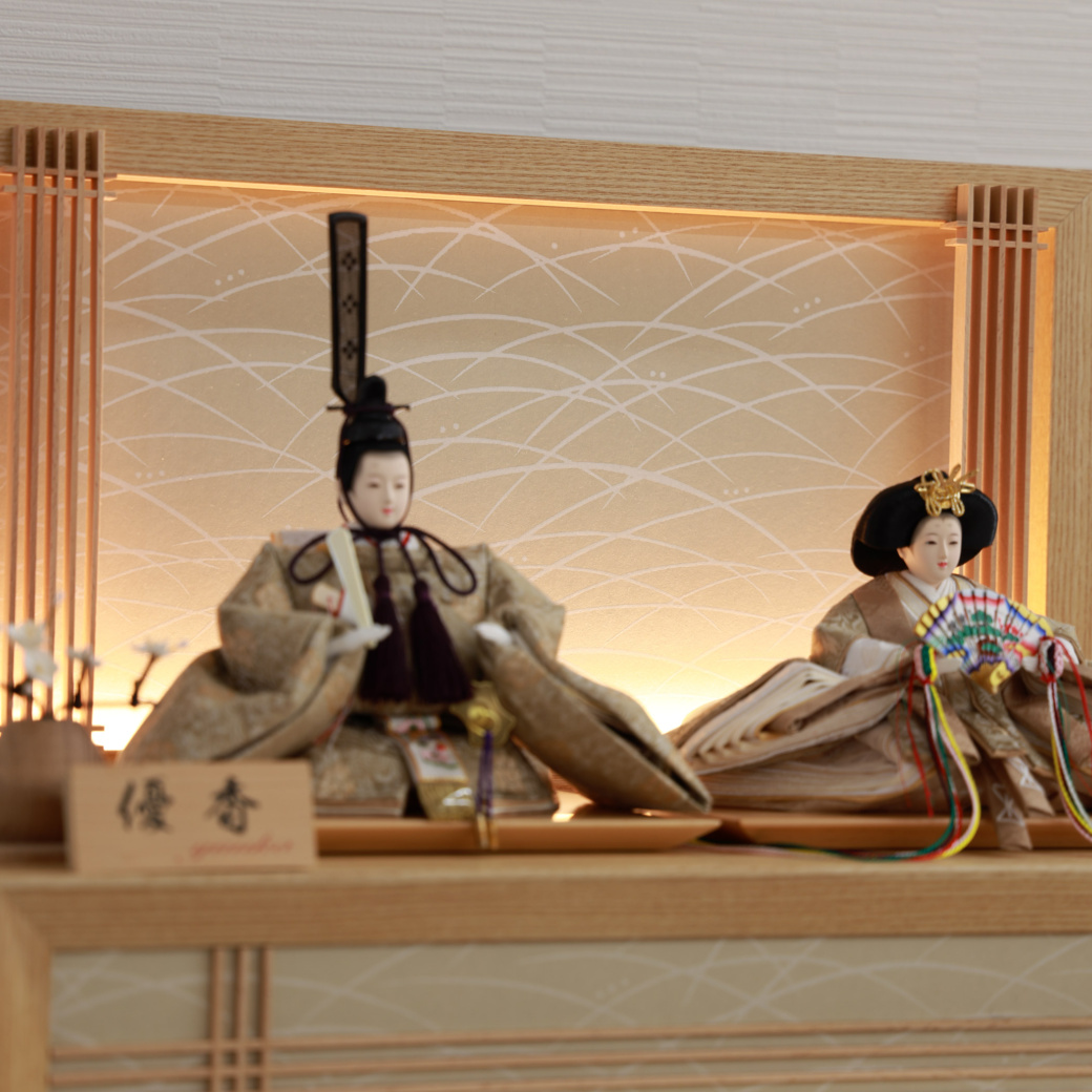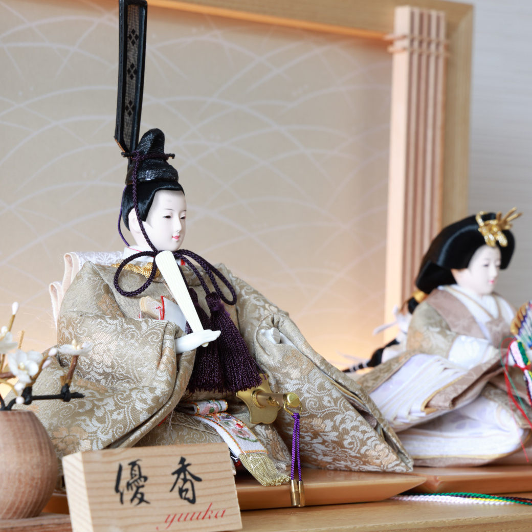 節句人形工芸士・優香が手掛けた親王飾り。人形の衣裳は金襴を使用し、本物志向の商品。職人技が光る美しいデザインが特徴です。女流作家優香の手による繊細な作りにより、ナチュラルな色合いが上品な雰囲気を演出します。