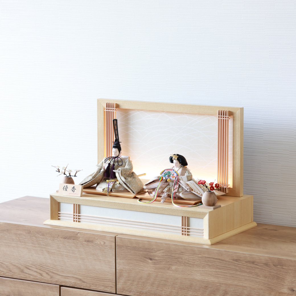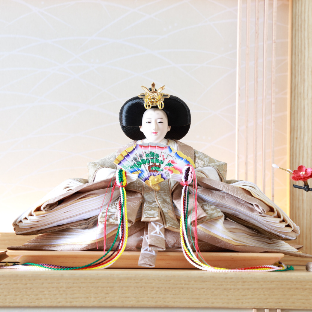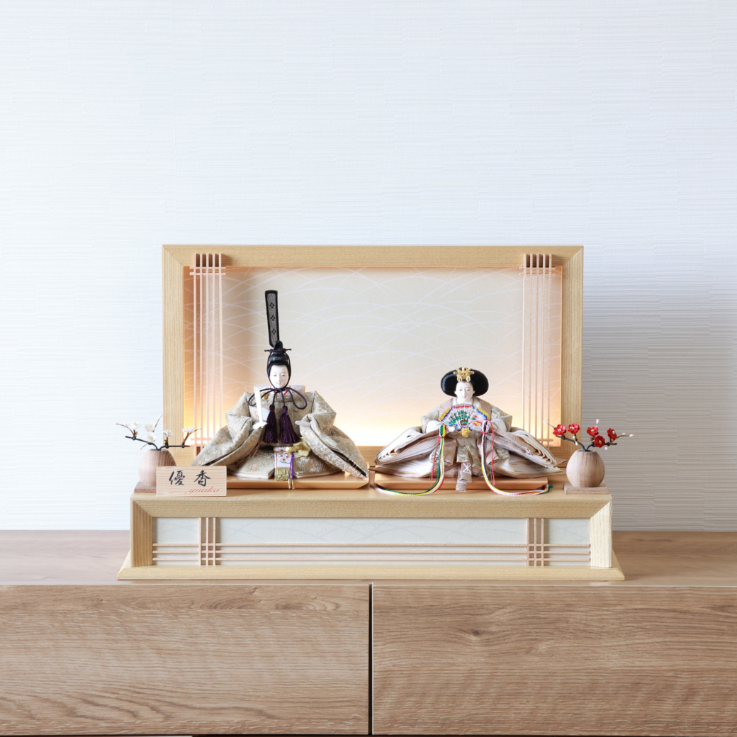 節句人形工芸士・優香が手掛けた親王飾り。人形の衣裳は金襴を使用し、本物志向の商品。職人技が光る美しいデザインが特徴です。女流作家優香の手による繊細な作りにより、ナチュラルな色合いが上品な雰囲気を演出します。