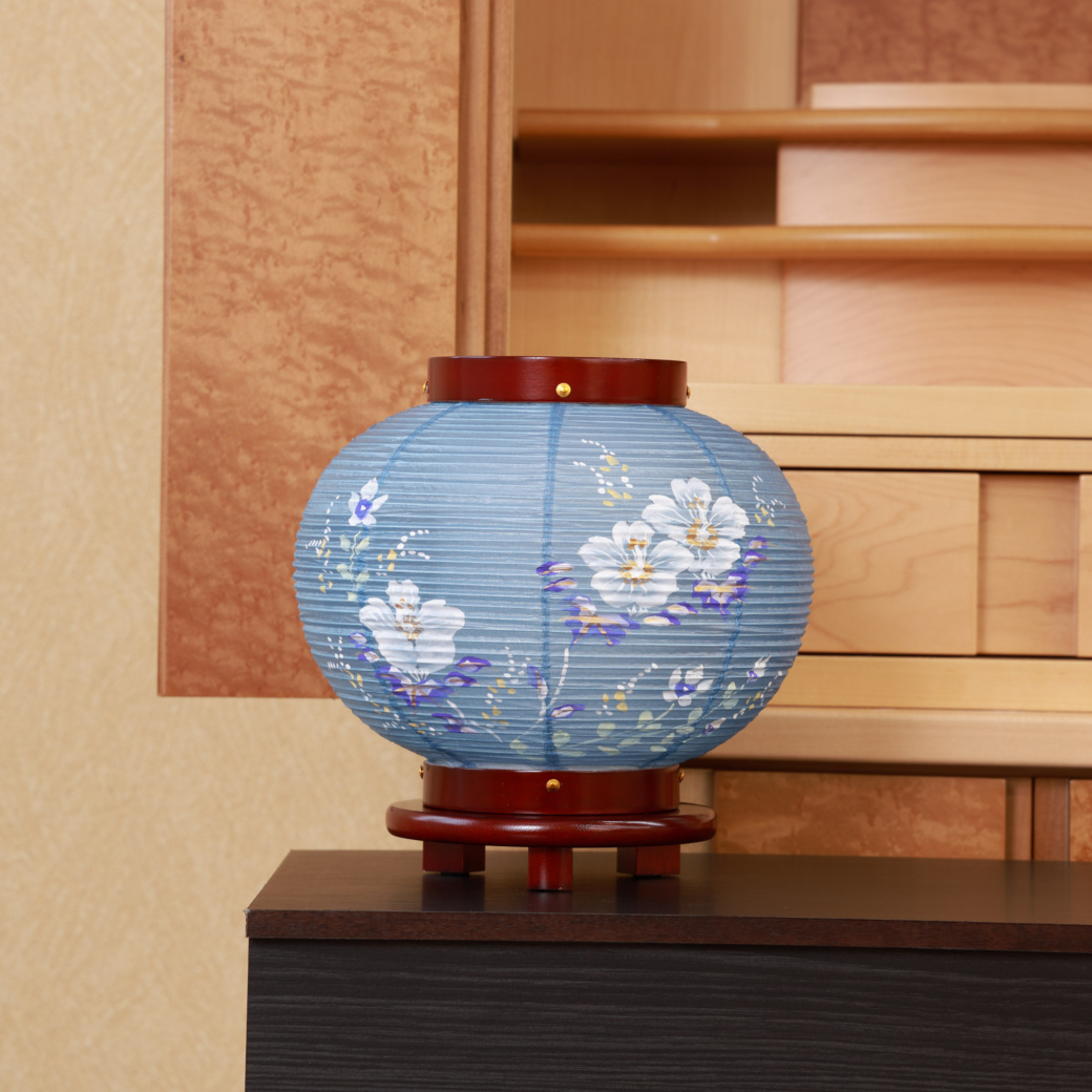 藍染の外絹火袋に芙蓉柄を使用しています。