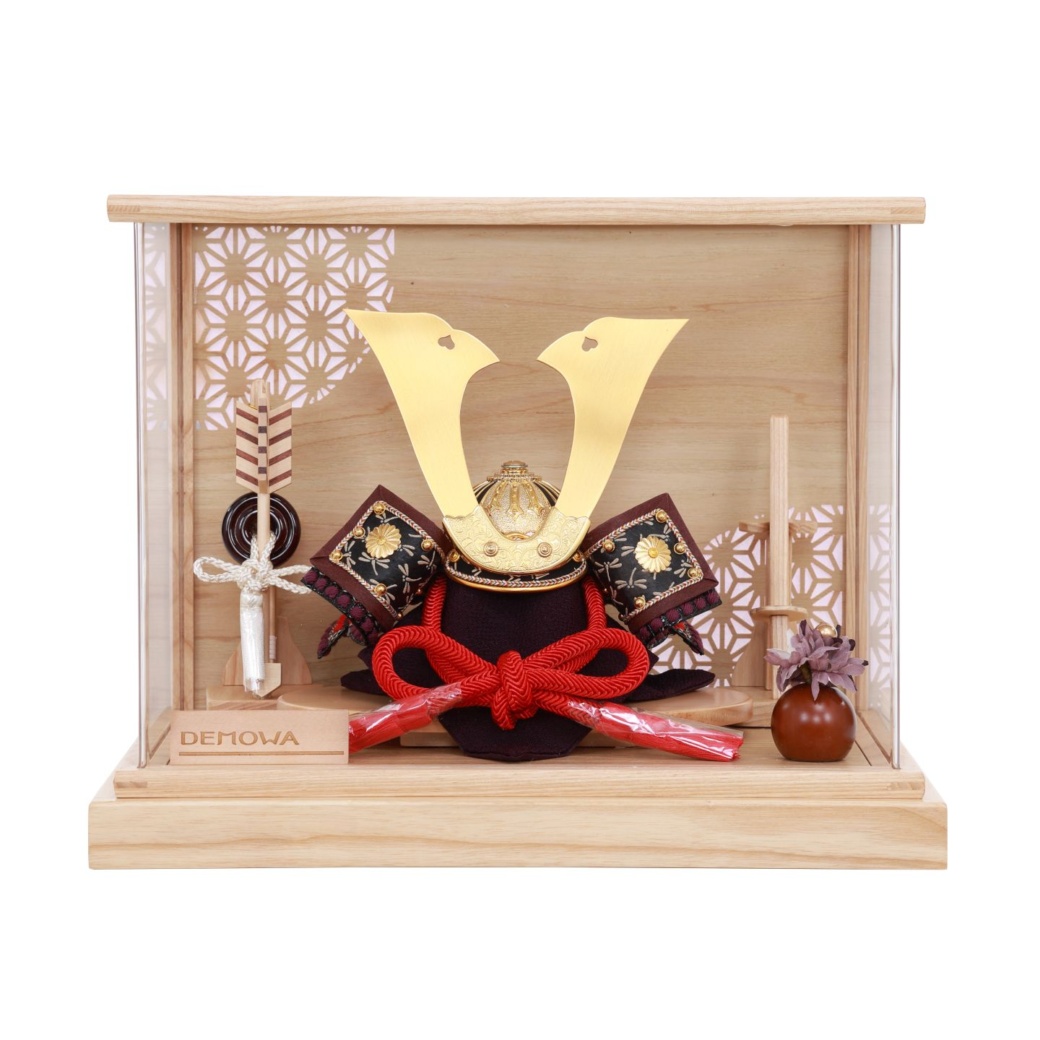 鮮やかな赤糸縅しの兜にぬくもりのある木目調のアクリルケースをセットしました。