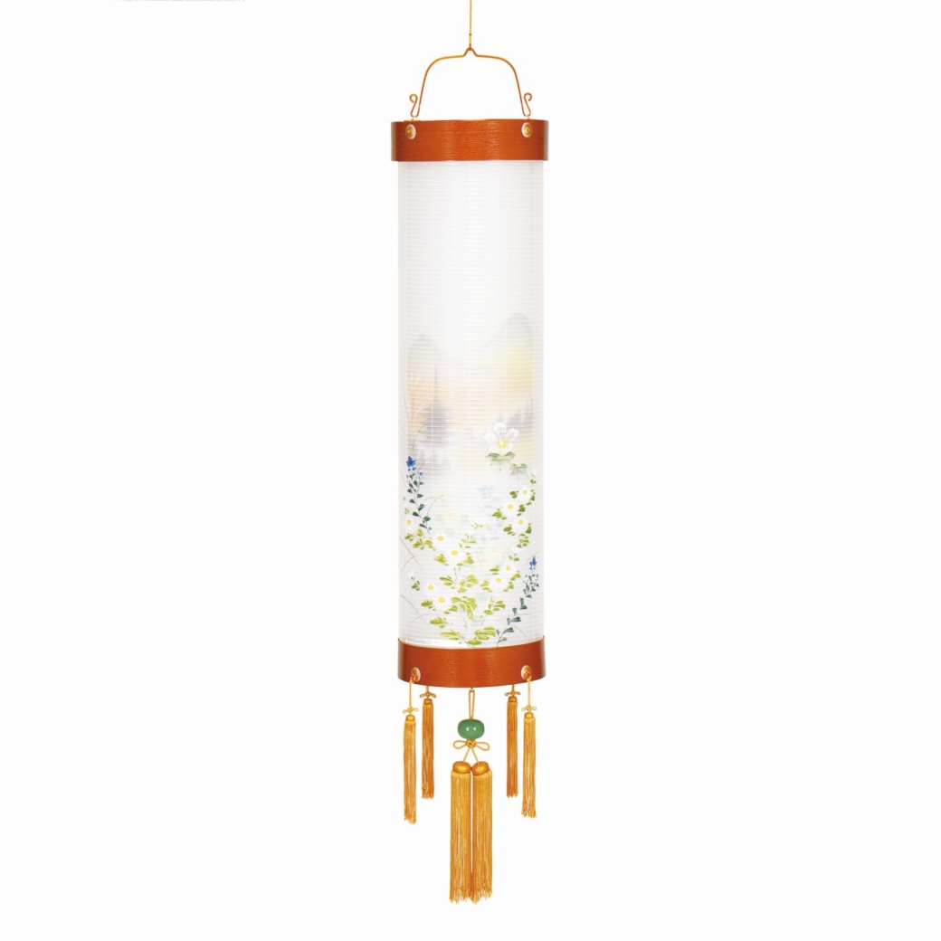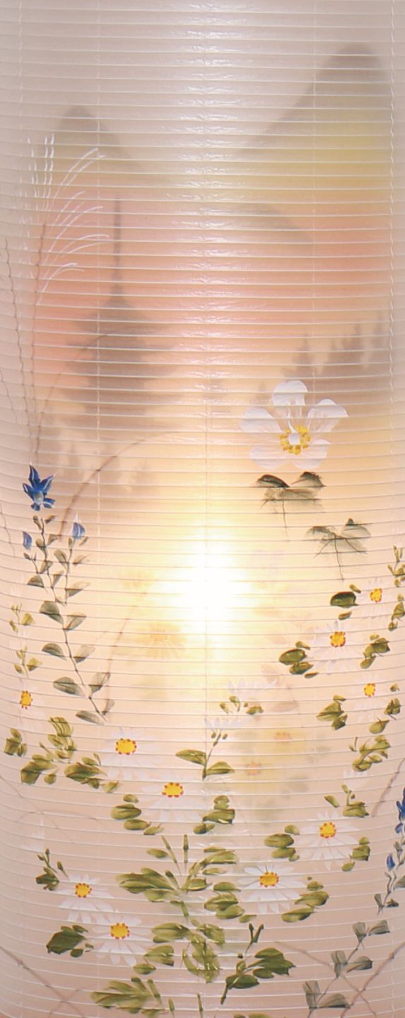 部屋の天井から、あるいは吊台に掛けて吊るす住吉提灯です。芙蓉、菊、桔梗、ススキ柄の秋の七草を描いた外火袋は正絹、五重塔に夕焼け山水柄を描いた中火袋は和紙です。