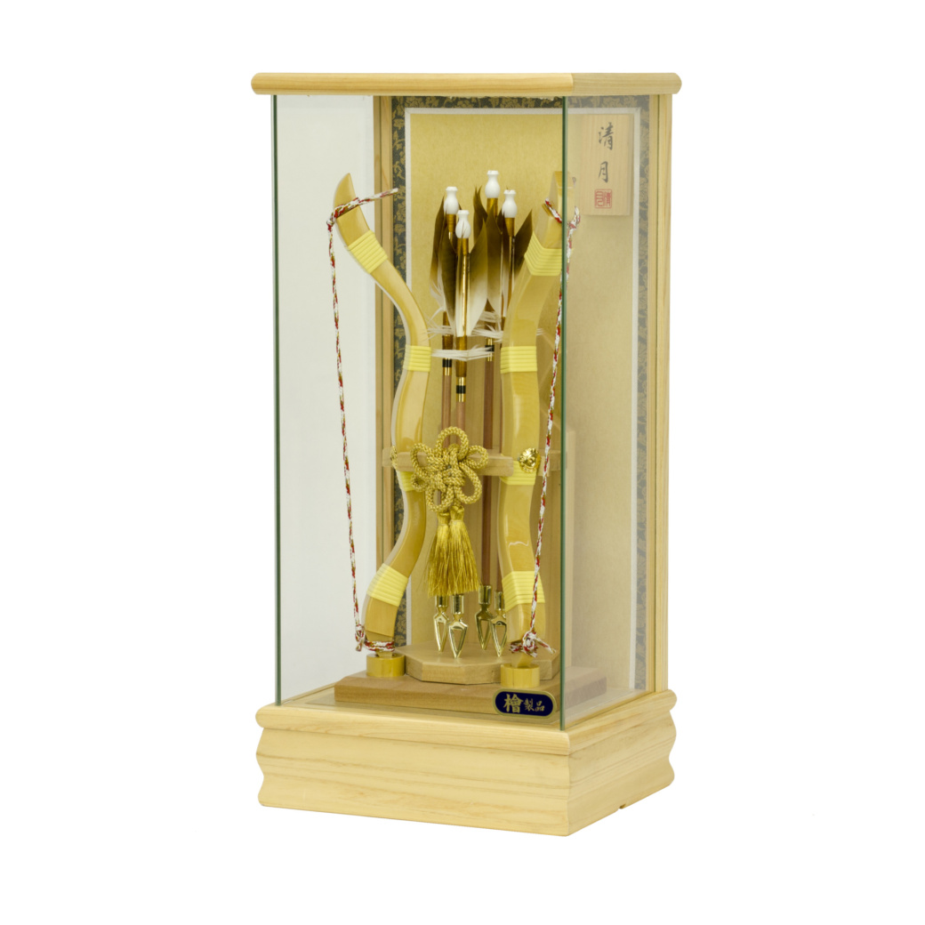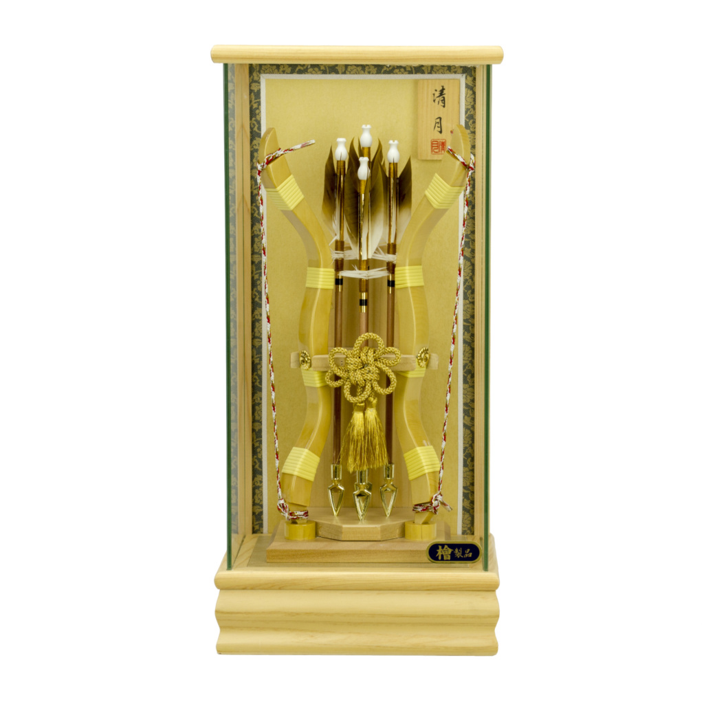 四方から守るとの意味のある四本の矢羽根と木製の二本の弓をセットしました。