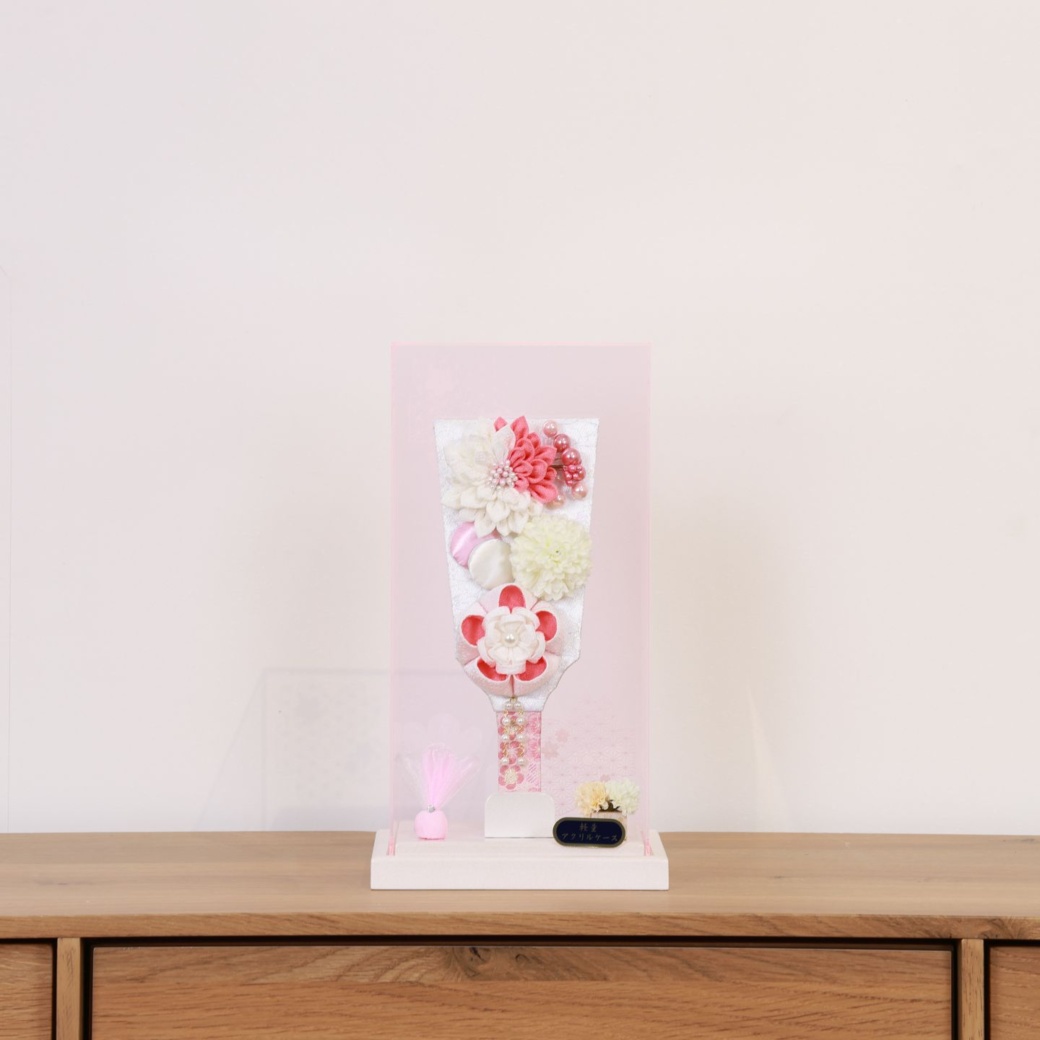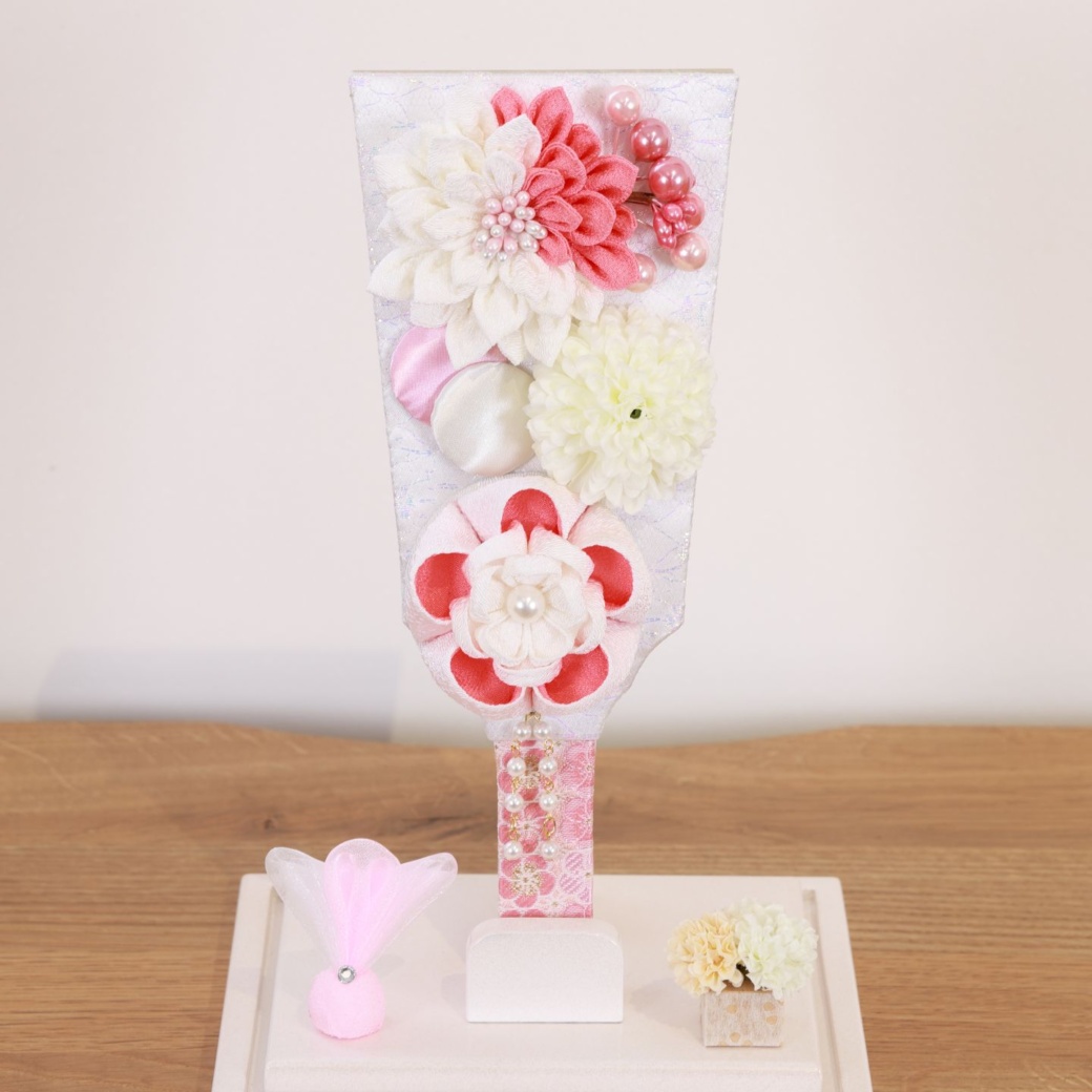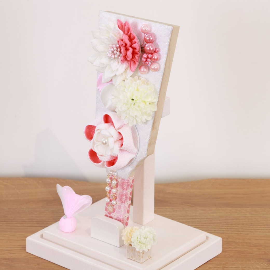 つまみ細工と造花を取り付けた可愛らしい羽子板とセットした場所を取らないコンパクトな飾りです。『つまみ細工』とは薄い絹または薄いちりめんを1~3cmの角形に切り、ピンセットで三角形に折り、紙に張り付けて、花などの形に作ったものです。羽子板と一緒に可愛らしい羽根飾りも付属し、彩りを添えています。