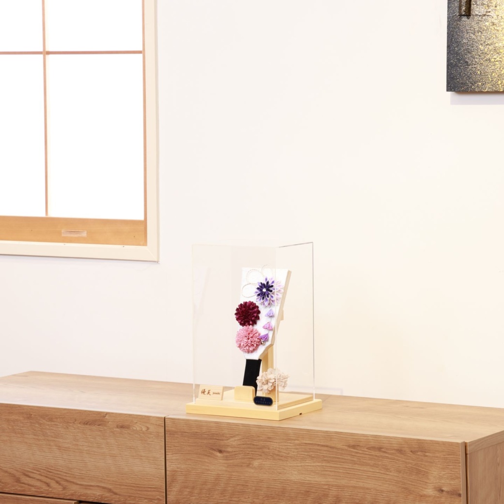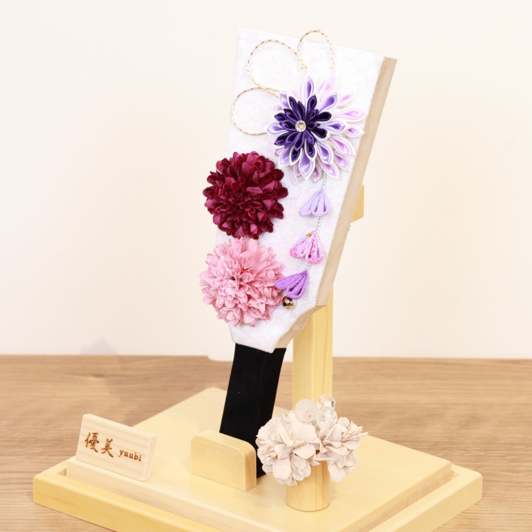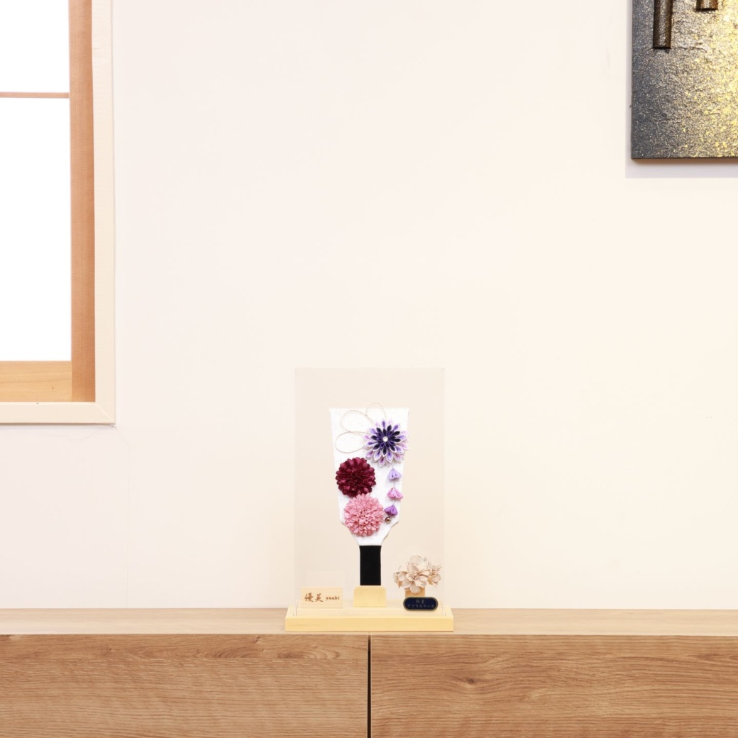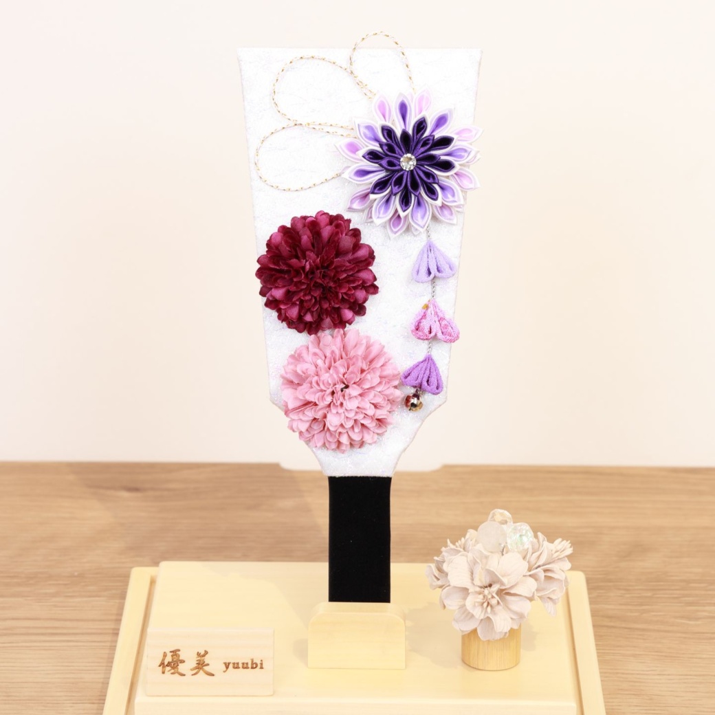 紫色のつまみ細工と造花を取り付けた可愛らしい羽子板とセットした場所を取らないコンパクトな飾りです。『つまみ細工』とは薄い絹または薄いちりめんを1~3cmの角形に切り、ピンセットで三角形に折り、紙に張り付けて、花などの形に作ったものです。羽子板と一緒にまり飾りも付属し、彩りを添えています。