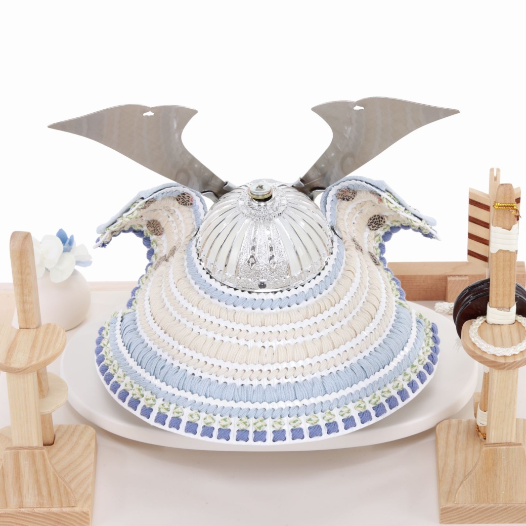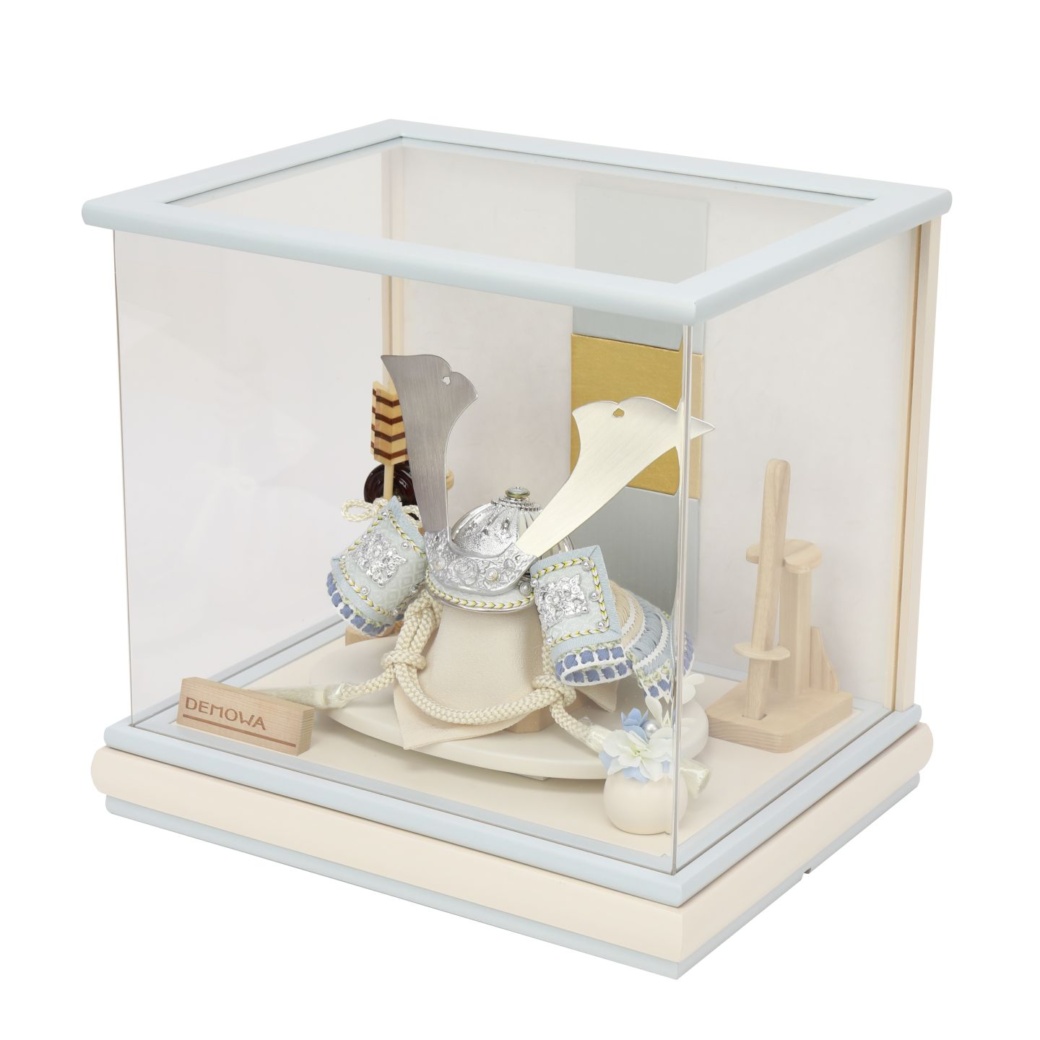 シルバー仕上げの兜にナチュラル色のアクリルケースにセット洋室マッチしたお飾りです。