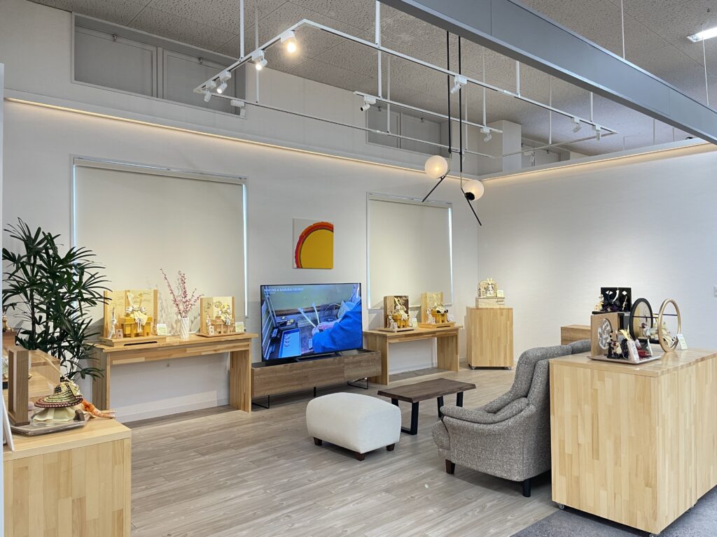 ただいまの期間「八女人形会館」では広い館内にて、たくさんのお商品を展示販売しております。