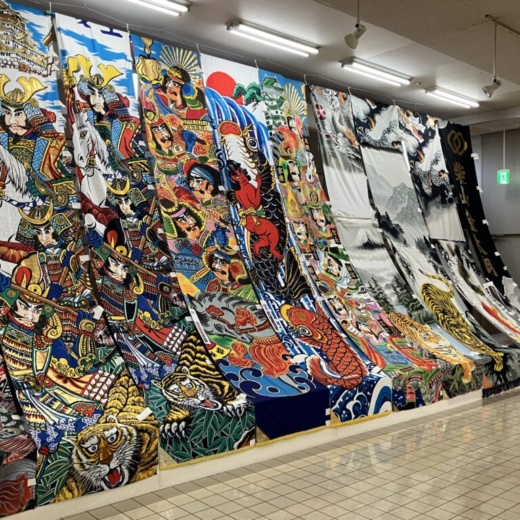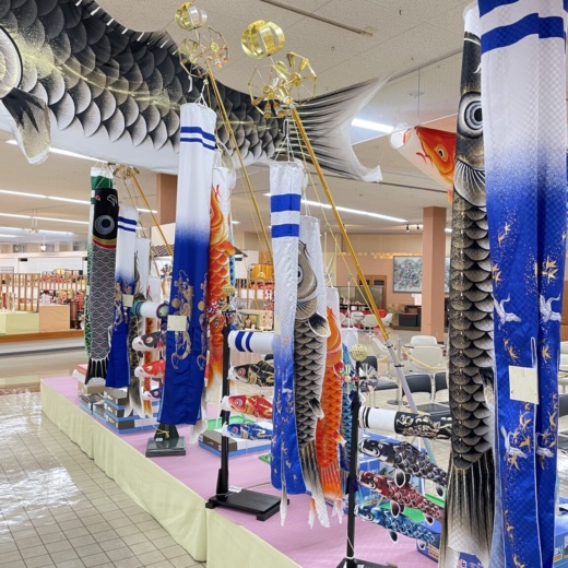 ただいまの期間、八女人形会館では武者幟・鯉のぼりを展示販売中です。