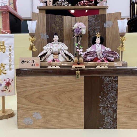 間口50cm・奥行33cm・高さ52cmのコンパクトなサイズですので、スペースをとらずに飾ることができ、季節以外には収納箱で保管していただけます。4枚目の画像のように「名前旗」を添えることで、より華やかな雛人形飾りとなります。