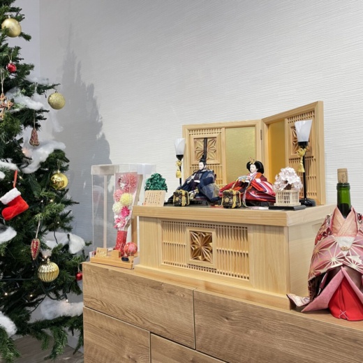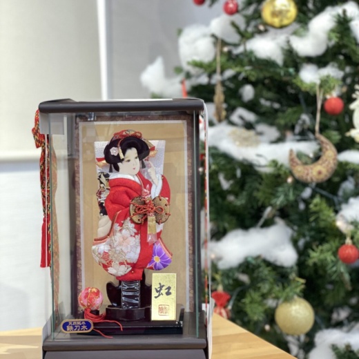 八女人形会館では、お客様をお迎えする大きなクリスマスツリーとともに、さまざまなお正月飾りを展示・販売しております。