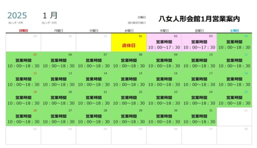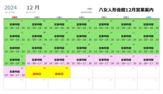 八女人形会館より、年末年始の営業時間についてお知らせします。