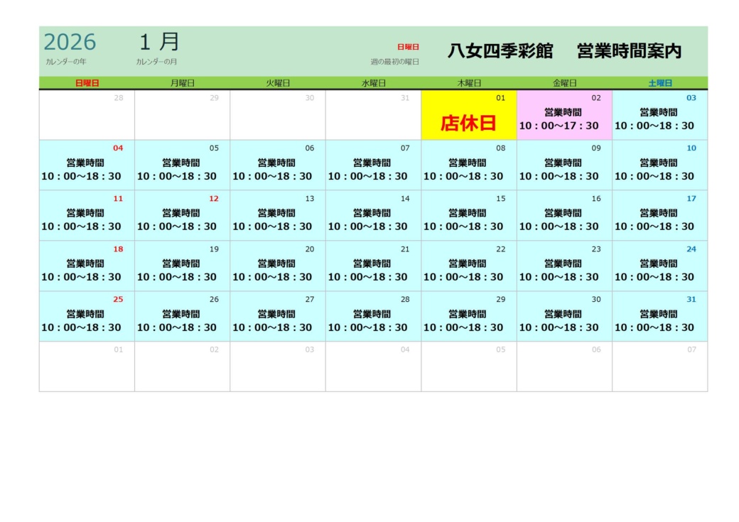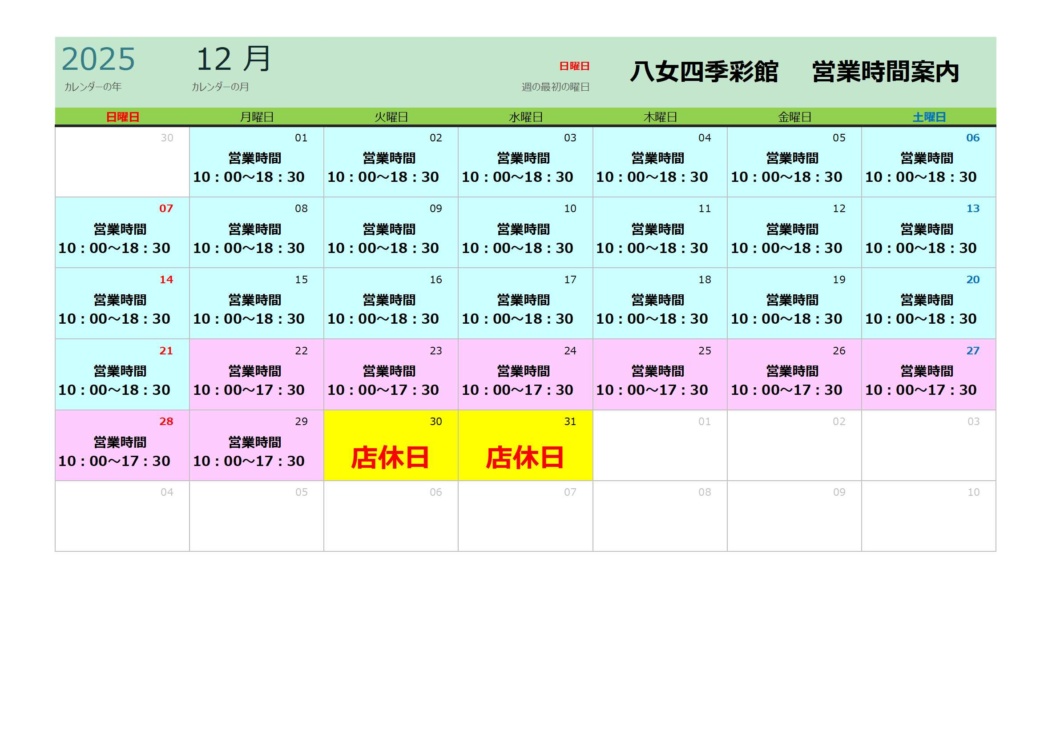 八女四季彩館は年内12月29日(月)まで営業いたします。年明けは1月2日よりの営業となりますので、ご来店の際はお間違いのないようお気をつけください。