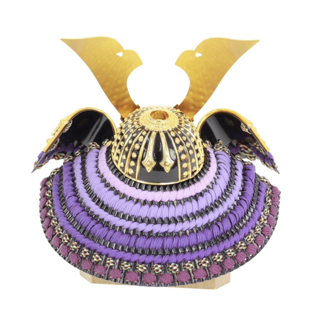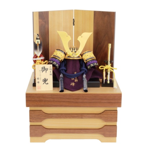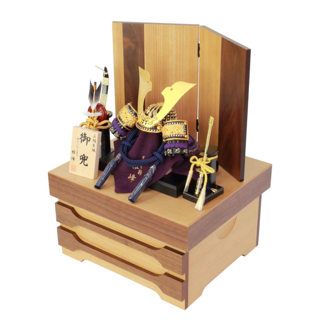 ブラウンナチュラル木目の屏風・収納箱に紫段糸縅し兜飾り