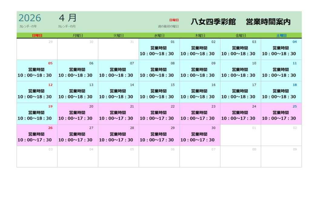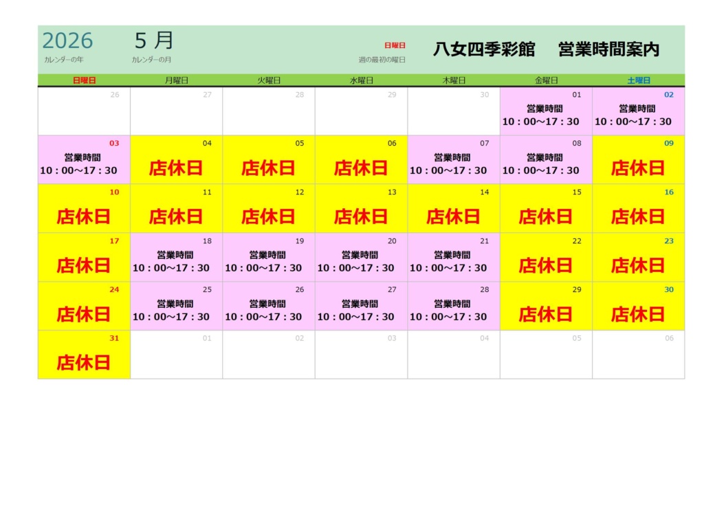 4~5月の営業日および営業時間は以下のカレンダーをご覧くださいませ。