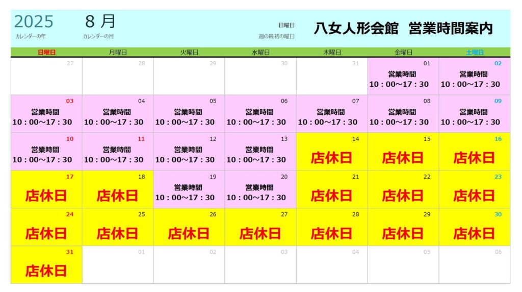 八女人形会館は、8月13日(水)は10:00から17:30まで営業いたします。翌日8月14日(木)からは休業となりますので、ご来店の際はお間違いのないようお気をつけください。