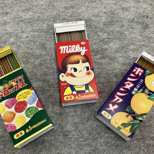 お線香やロウソクのセットもバラエティに富んでいます。懐かしいお菓子のお線香は点火すると甘い香りが漂います。
