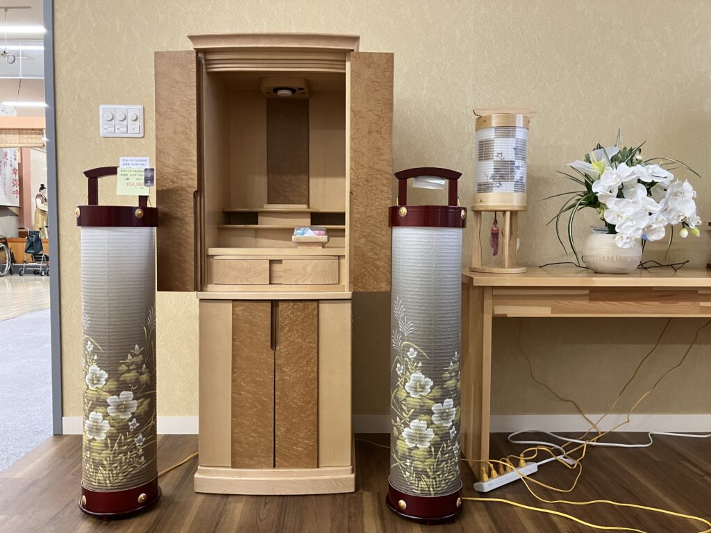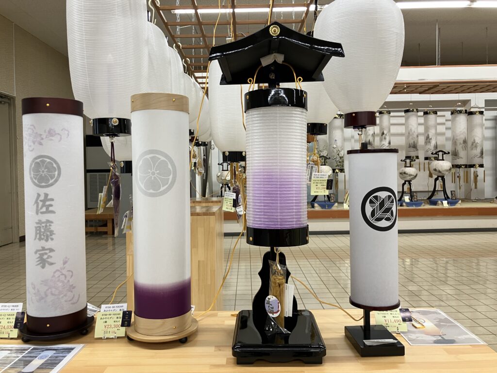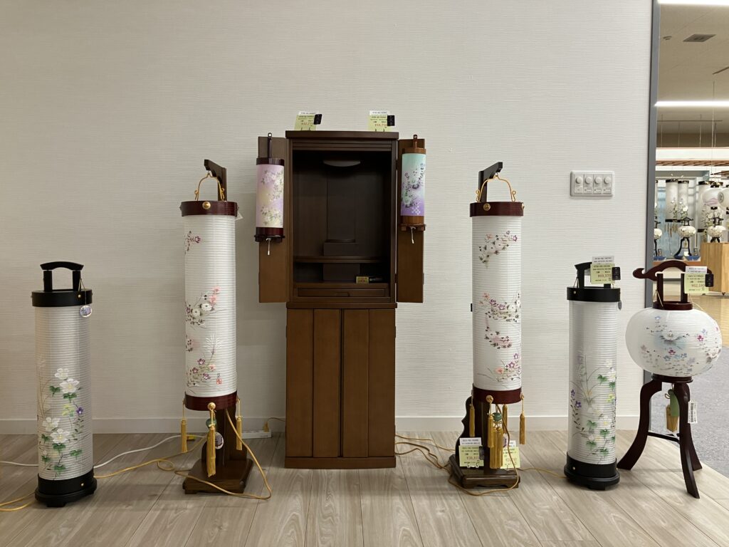 お仏壇にあわせた様々な提灯も展示しております。