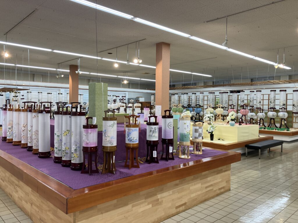 「日本最大級の展示場に県内随一の品揃え」の八女人形会館では、多数の盆提灯を展示販売しております。