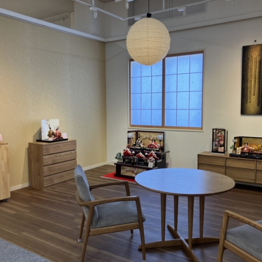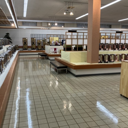 八女人形会館では、節句人形のご案内のため、羽子板・破魔弓・雛人形・五月人形などさまざまな製品の展示作業をおこなっております。