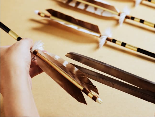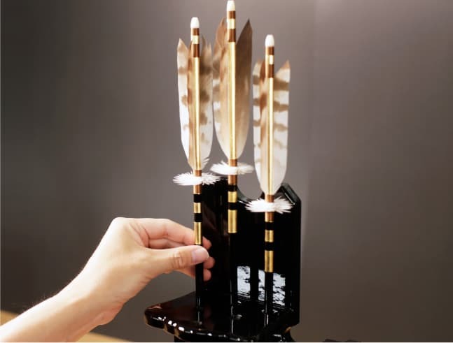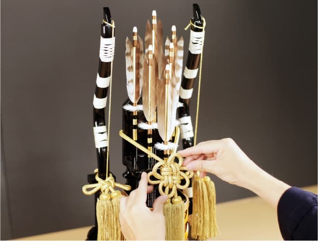 一方の破魔弓は、「的」を射る弓矢から「魔を破る」とされ、古くから魔除けの力を持つ縁起物です。鎌倉時代には男児の成長を願って贈られる習わしが生まれ、今も続いています。空へ真っすぐ伸びる姿には「凛々しく育ってほしい」という家族の深い祈りが宿ります。